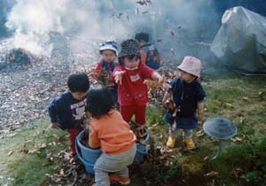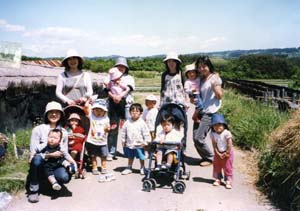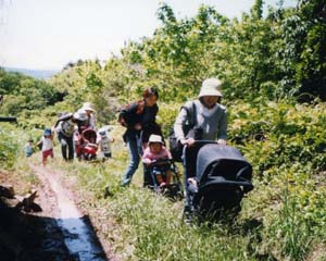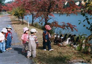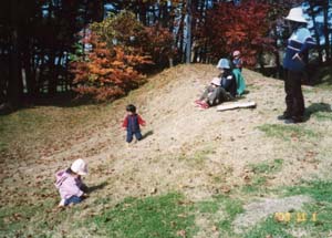 分乗して当地へ。現地到着10:40 どんなところだろう…、うきうきしながらやって来ました。ローラーコースターのある小山をのぼっていくとどんぐりがたくさん落ちています。子供たちはとても喜んで拾いながら進みます。小山の傾斜を使った長いローラーコースターがあらわれました。お尻に専用のシートをひいて「こわごわ」滑る子、「きゃあきゃあ」滑る子いろいろです。さらにその下に幼児にぴったりの小さな滑り台もあり、そこで思う存分遊びました。チビちゃんはこの滑り台でも十分かな。少し登って木陰でお弁当にしました。小山を下ったあと、釣り堀で魚釣り。お母さんは子供のために釣って上げようと必死です。釣った魚をその場で調理してもらいいただきました。魚を釣ることができ、子供たちはまた一つ新しい体験!解散14:30