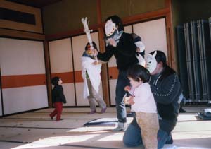 | 集合10:00 前回活動で作成した豆まきグッズを使って豆まきをしました。お母さんたちが「こわ?い」鬼になって子供たちに近づいてきます。前回作ったお面や金棒が活躍です。凝った演出をしてシーツをまいて鬼に変身するお母さんまで現れました!豆が飛び交い子供たちは大喜びで、走り回ります。大はしゃぎした後は、子供たちも豆拾いをして一緒に片づけをします。たくさん動いたのでお弁当が美味しいね。解散13:30