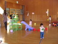 | 今日は台風9号の為、「びんぐしの里公園」は残念ながら中止して未来館で遊びました。トランポリンやブロック、滑り台やフラフープ、子供達なりに、色々工夫しながら楽しんでいました。 12時頃、お弁当を食べて解散となりました。(j.k) | |||